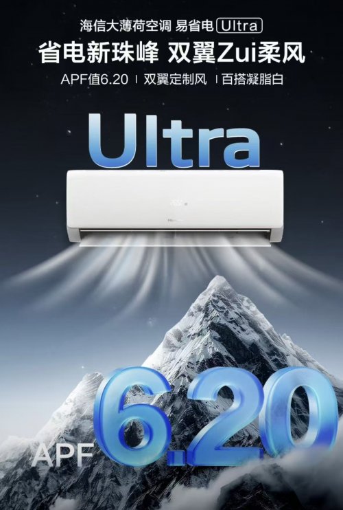 海信空调易省电Ultra采用第10代Hi-smart高效全直流驱动技术,主打日常高频场景的稳定省电。该技术通过智能调控压缩机运行参数,不仅将压缩机效率提升3%,还将核心电子部件的寿命延长11%;同时搭配500级电子膨胀阀与内外机双排满配设计,能精准控制冷媒流量,避免传统毛细管节流的能源浪费,AI模式下海信易省电Ultra的APF值可达6.2,省电率达41%,完全满足日常节能需求。